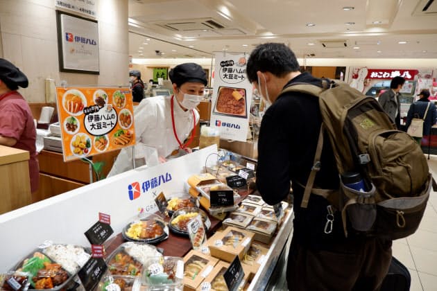 3月末、東京駅改札内の商業施設「グランスタ」の弁当エリアに大豆ミート専門の店舗が現れた。伊藤ハムグループの伊藤ハムフードソリューション(東京・目黒)が期間限定で開いた店舗だ。「大豆ミートのそぼろ弁当」や「大豆ミートのハンバーガー キーマカレー」などの植物肉を用いた約20の商品が並んだ。