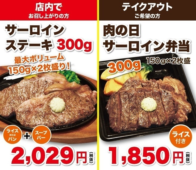 ステーキのどんは、肉の日限定メニューとして肉が倍盛の「ダブルサーロインステーキ」(店内2,029円、以下税別)、「ダブルサーロインステーキ弁当」(テイクアウト1,850円)を提供する。人気のサーロインステーキが300g(150g×2枚盛)のボリューム満点なメニュー。店内飲食は、おかわり自由のライス・パン・スープバー付。弁当はライス付。