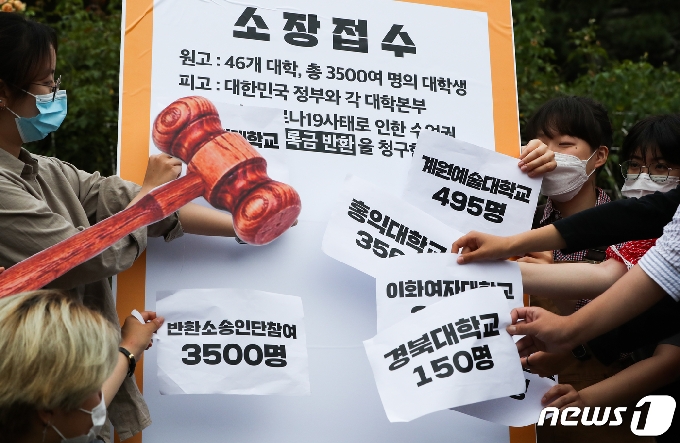 | 전국대학학생회네트워크 등록금반환본부 소속 대학생들이 지난 1일 서울 서초구 서울중앙지법에서 기자회견을 열고 '전국 42개 대학 3500명 대학생 등록금 반환 집단 소송 선포' 퍼포먼스를 하고 있다./뉴스1 © News1 |